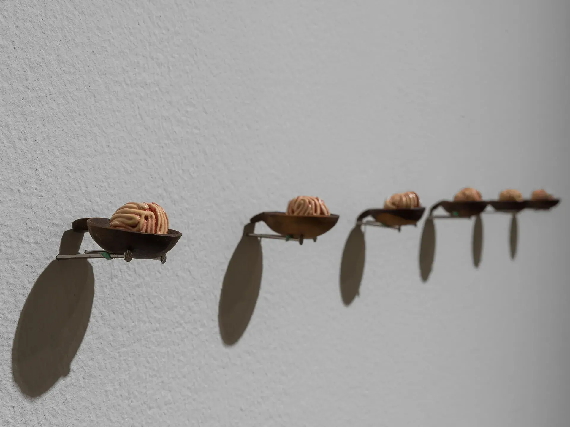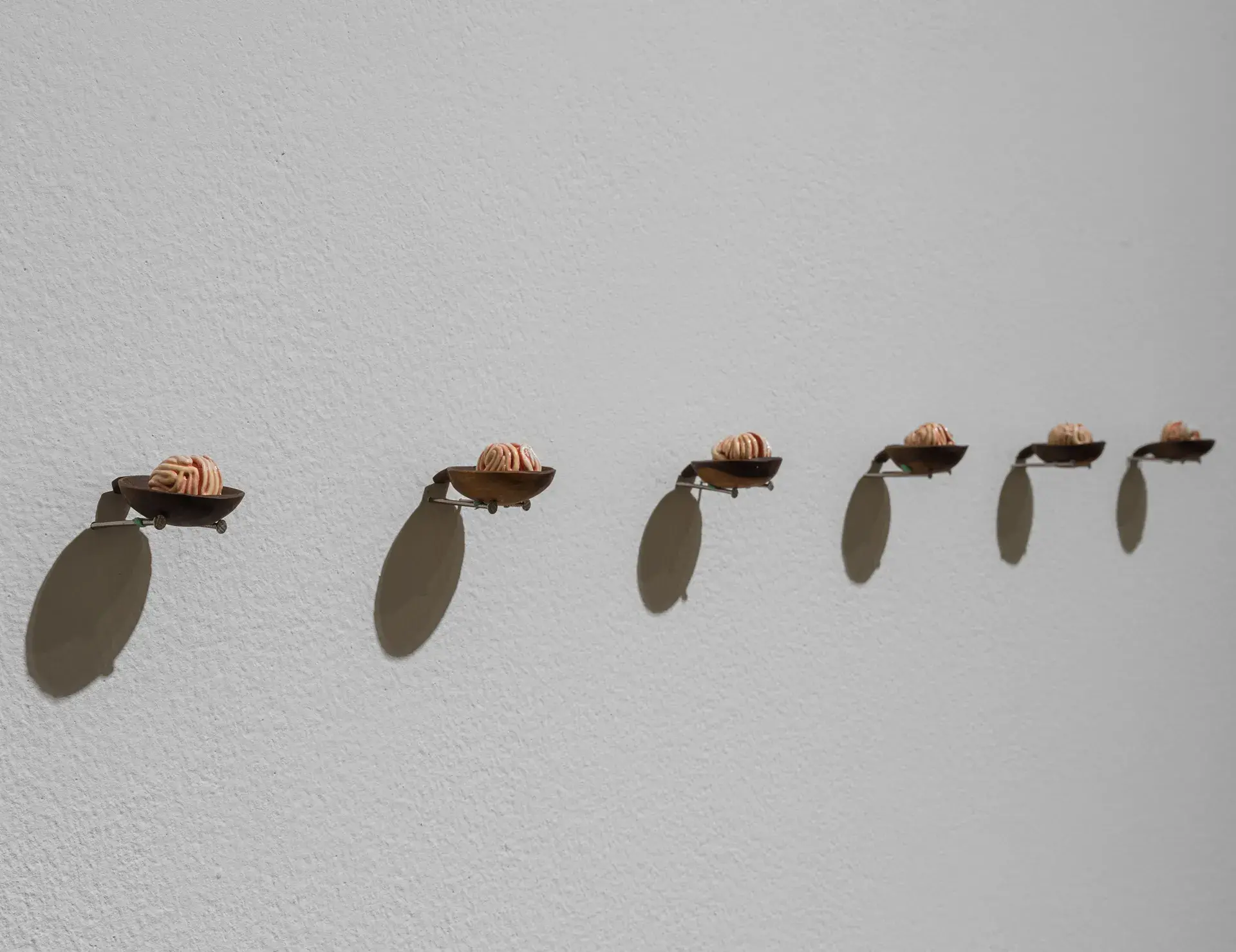 A series of tiny bite size brains are placed inside wooden spoons. The work plays around the different words and vocabularies that are generated in the market, it also ponders upon the abstraction of these words from its original source of the organ and larger body and the vernacular. The work aims to highlight the hierarchies in which meat is devoured and consumed.